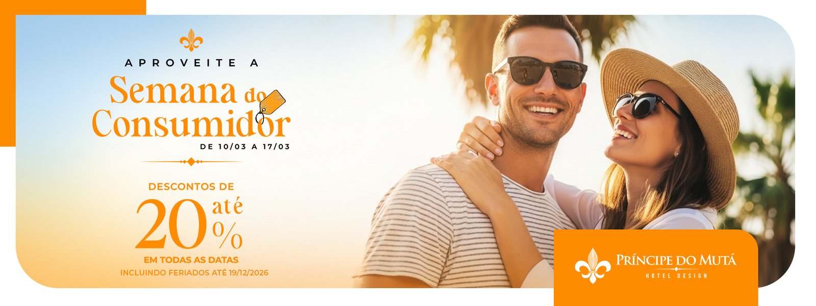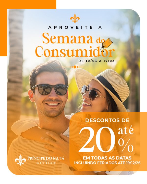Na Semana do Consumidor, celebramos você com a oportunidade de planejar sua próxima escapada para o paraíso. De 10 a 17 de março, garanta sua viagem dos sonhos para o Hotel Príncipe do Mutá com descontos de até 20% OFF para se hospedar em qualquer data até 19 de dezembro de 2026, incluindo feriados. A escolha é sua, o privilégio é nosso.
